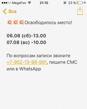 Девочки, в связи со своей загруженностью, я стала появляться на сайте реже. Вы, конечно, можете записываться и здесь, но оперативнее и быстрее будет если вы свяжетесь со мной по телефону, WhatsApp, Viber или СМС. Телефон практически всегда рядом))))