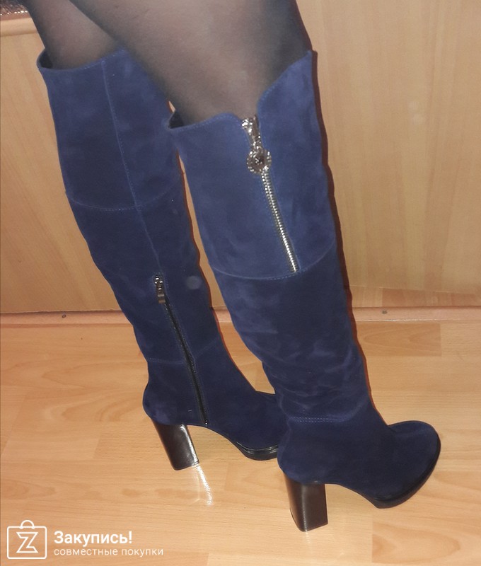 Цвет изумительный....Одна печаль: обувь без каблука заказывала в черной коже, но по факту пришли обе модельки в идентичной темно синей замше (цветопередача отличается из-за вспышки).