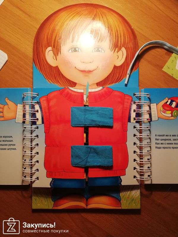 Добрый день. Рекомендую вам обратить внимание на книжку-тренажёр Одеваюсь сам. Мой вариант, как вы заметили, для мальчиков. Есть ещё вариант для девочек. Книга предлагает ребёнку научиться застегивать молнии, пуговицы, липучки, пряжки, а также завязывать шнурки и ленточки. Качество хорошее.