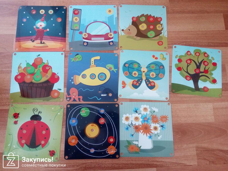 Добавлю... я очень довольна, что взяла мозайку с большим количеством карточек. Т.к. спустя неделю дочь собирает уже по 10 карточек, при том, что некоторые не по разу. Если и брать мозайку Мини, то либо дозаказывать нужные карточки, либо как то делать самим шаблоны, 4 карточки- будет очень мало даже для годовастика. На некоторых карточках всего по 5-6 отверстий, нам тоже это очень мало, думаю вот чем сделать ещё дырочки... Ну и я сомневаюсь, что после трех лет эта игрушка займет надолго, а вот для возраста 1-2 года - ну просто идеальная развивашка, яркая и интересная.