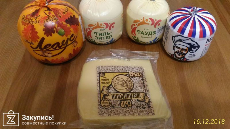 Попробовала все 5 видов сыра, что брала и теперь готова написать свой отзыв.))) Общий вывод: ВЕСЬ СЫР ВКУСНЫЙ!!! Если распределить их по моему вкусу, особо бы выделила швейцарский, он на 1 месте, 2 - «Maitre Fromager», 3 - «Гауда», 4 - «Леаус» и на последнее поставила бы «Тильзитер», но лишь только потому, что он слишком мягкий. Однако, я бы сказала, что эти сыры лучше кушать не на бутерброд, а просто пластиками, на бутерброд подходит только швейцарский, остальные пресноватые. РЕКОМЕНДУЮ!!! Организатор сработала на отлично! Олеся, большое спасибо за вкусную закупку!