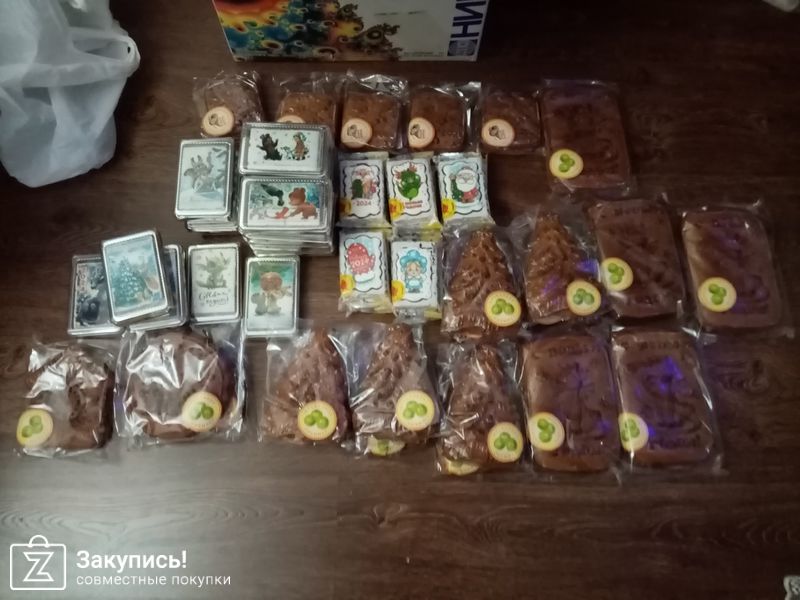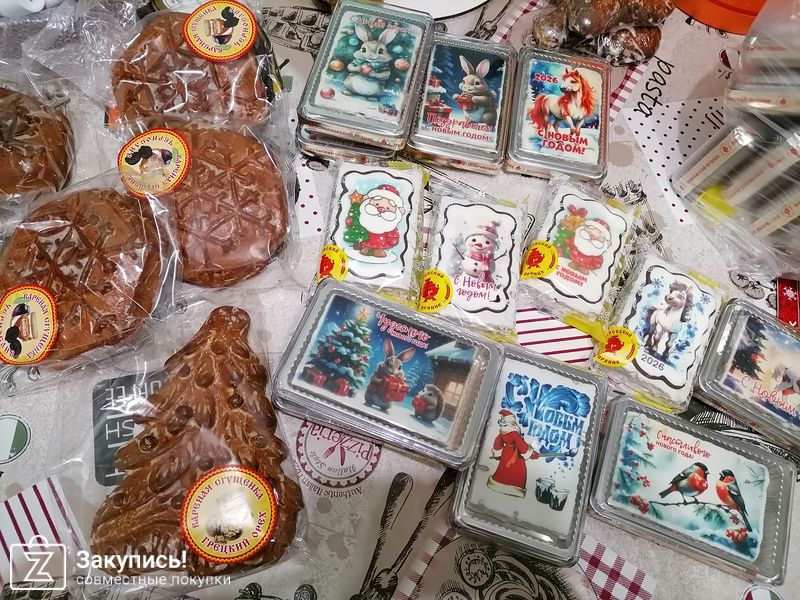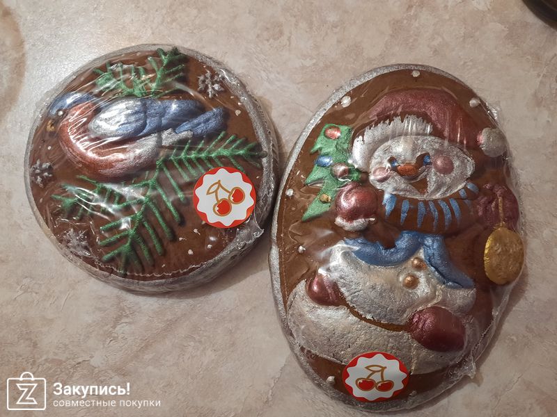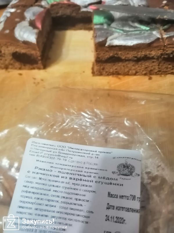Очень огорчена покупкой этого года. Мы забыли про наши пряники, только сегодня попробовали. Заказывала Дед Мороз с телефоном императорский 700 гр.с варёной сгущёнкой, да ещё и две штуки. В действительности никакой варёной сгущёнки НЕТ, обычное повидло, не поняла даже какое, не то малиновое, не то вишнёвое, но красного цвета, хотя на этикетке написано, что с варёной сгущёнкой.((((( ОБМАНУЛИ..... Конечно это не вина организатора, она свою работу выполнила на отлично, это вина производителя.