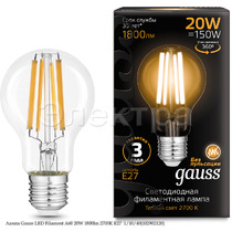 Лампа Gauss LED Filament А60 20W 1800lm 2700К Е27 1/10/40(102902120)