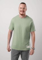 Фуфайка с коротким рукавом среднего объема, круглым вырезом горловины, которая оформлена обтачкой из рибаны.— Описание у На сайте поставщика