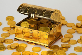 Золотой сундук. Конфеты в виде монеток из натурального темного шоколада