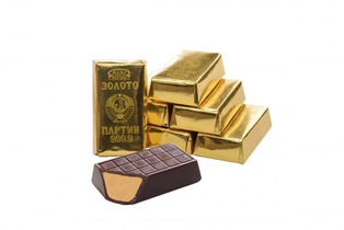 Конфеты в форме слитка в шоколадной глазури со светлой начинкой и вкусом: "Арахисовая паста".