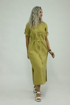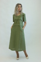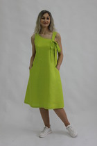 Платье полуприлегающее с ассиметричным рельефом. Рукав – крылышко. Объём по талии регулируется декоративными завязками. В среднем шве спинки молния. Низ изделия асимметричный. Длина изделия 110 см.