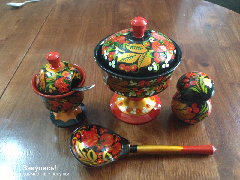 заказывала вазу для варенья, ложку, потом насмотрела солонки. Такая красота пришла! Плотная лакировка, рисуночки- прелесть, тонкая прорисовка. все блестит- как раз на пасху стол украсит!
