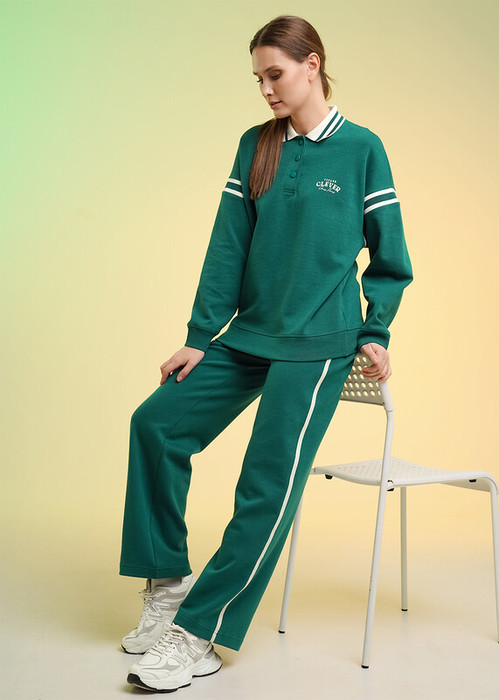 Джемпер из трикотажного полотна дабл фейс. Длинный рукав со спущенной линией плеча. По горловине вязаный воротник с планкой на кнопки. По окату рукава вязаная отделка. По низу рукава манжет из кашкорсе,по низу изделия из основного полотна. Спереди принт.