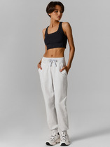 Брюки изготовлены из трикотажного полотна футер. Брюки прямые с высокой посадкой. Пояс отрезной из рибаны с эластичной тесьмой внутри. В передней части пояса с лицевой стороны пробиты петли и втянут шнур. Шов втачивания пояса распошит. Спереди обработаны карманы хулиганы. По низу брюк отрезные манжеты из рибаны.