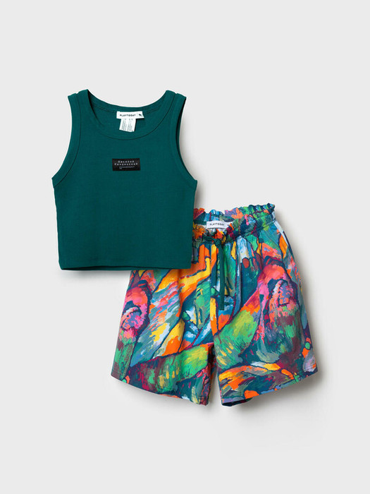 Летний женский комплект. Состоит из укороченной майки и шорт с ярким художественным принтом. Майка выполнена из мягкого риба и украшена чёрной нашивкой. Шорты выполнены из тонкого хлопкового трикотажа. Принт на шортах выполнен на основе картины Василия Кандинского «Импровизация 7». Это абстрактная живописная композиция, созданная художником в 1910 году. Они имеют эластичный пояс с завязками и боковые карманы. Можно составить family look с детским вариантом аналогичного дизайна.