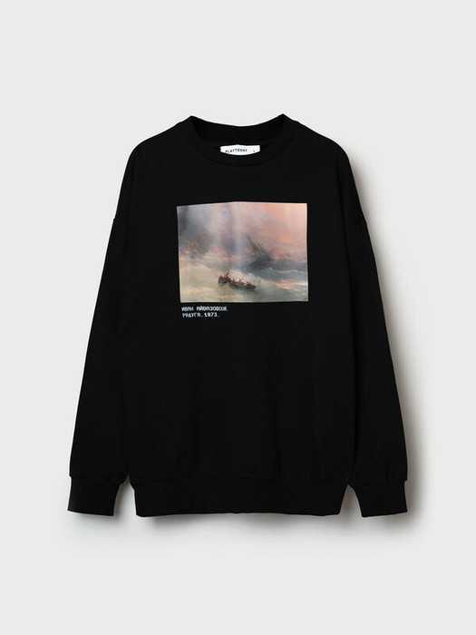 Мужской черный свитшот оверсайз. Выполнен из хлопкового футера без начеса. На груди расположен крупный принт — репродукция картины Айвазовского «Радуга». Под изображением — подпись с названием и датой создания картины. Горловина, манжеты и низ изделия выполнены из эластичного риба, что обеспечивает комфортную посадку. Можно составить family look c детским вариантом аналогичного дизайна.