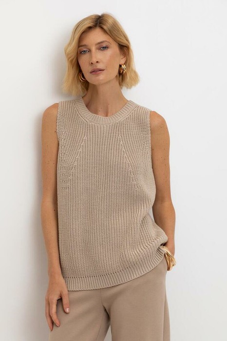 Нежный топ в классическом переплетении нитей цвета беж выполнен из итальянской хлопковой пряжи. Лаконичный стиль топа позволяет сочетать его в разных образах.