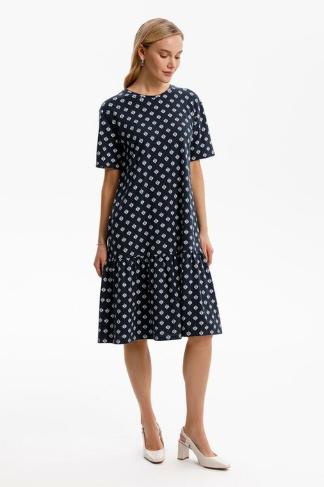 Летнее трикотажное платье из 100% хлопка с легкой текстурой пике, дарит невероятное ощущение комфорта и легкости.  Глубокий чернильный цвет и геометрические узоры придают изделию романтический вид. Спущенное плечо и карманы в боковых швах добавляют в образ расслабленности.