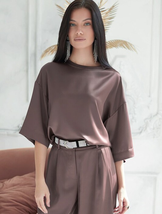 09.04 Vilatte Блузка свободная из струящегося плотного сатина D29.279 кофейный