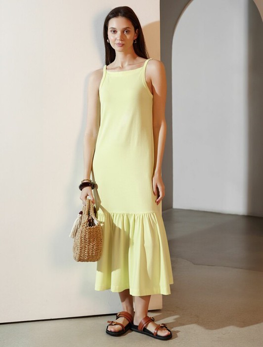 Стильное платье лимонного цвета выполнено из тонкого, гладкого хлопкового трикотажа плотностью 170 Г/м2.  Летнее платье длины миди отичается современным кроем на тонких бретелях, что придает образу легкость и женственность. Благодаря тому, что материал тянется, платье хорошо садится по фигуре и обеспечивает комфорт на протяжении всего дня. Эластичное полотно мягко обхватывает силуэт, не стесняя движений. Легкое длинное платье гармонично подчеркивает достоинства и подходит на любую фигуру и большие размеры. Особое внимание привлекает волан по низу, который добавляет романтичности и воздушности. Такая деталь делает дизайн более интересным, добавляя динамики во время ходьбы. Приятный к телу хлопок не вызывает раздражения и подходит для ежедневной носки. Сочетание гладкой текстуры и эластичных свойств позволяет платью выглядеть аккуратно и стильно даже после множества стирок. Повседневное платье прекрасно комбинируется с разной обувью и аксессуарами, что делает его универсальным вариантом на каждый день или для о