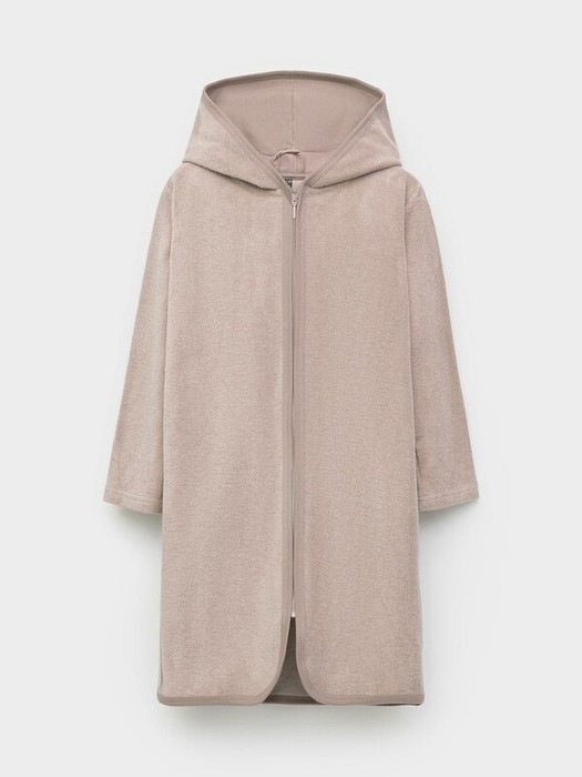 Халат на молнии с капюшоном. Изготовлен из мягкого махрового полотна, произведённого из натурального хлопка. В капюшоне подклад из высококачественного гладкого трикотажа супрем. Края обработаны эластичным кантом. Все трикотажные полотна производятся в соответствии с нормами швейцарского сертификата ЭкоТекс.