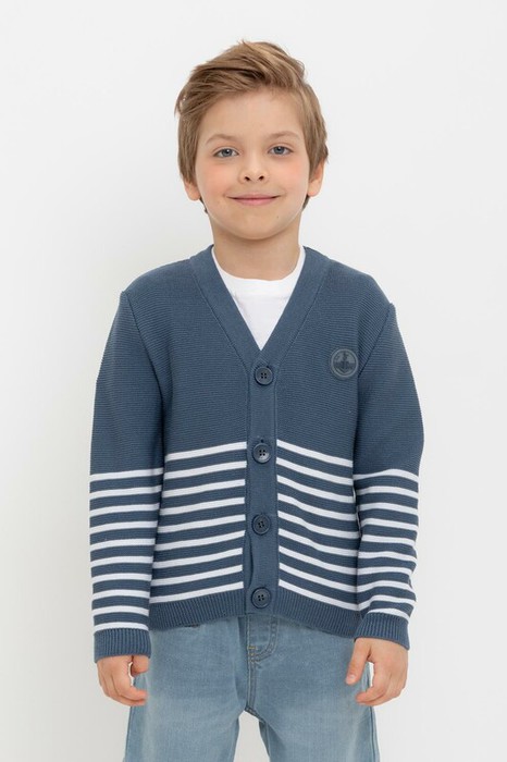 Вязаный кардиган в полоску для мальчика с втачными рукавами. Связан из хлопковой пряжи. На рукавах эластичные манжеты. Внизу мягкий пояс. Застёгивается на пуговицы.