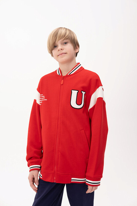 Бомбер для мальчика – трикотажная модель свободного кроя на позднюю весну, лето. Куртка-бомбер выполнена из плотного футера-петля с высоким содержанием хлопка. Воротник, манжеты по рукавам и низу изделия - из декоративной рибаны. На рукавах вставки из основного материала контрастного цвета. Боковые карманы расположены на переде под наклоном. Толстовка для мальчика украшена модным университетским шрифтом с засечками. Перед декорирован нашивкой – объемной мягкой аппликацией из бербер-флиса (барашек) и графичной шрифтовой композицией. Меховая нашивка буквой "U": unity – перевод "единство, командная сплоченность". Надпись: "Be present, listen to music, be with you BF, do things that make you happy #enjoy!" - перевод "Живи в моменте, слушай музыку, встречайся со своим лучшим другом, делай то, что делает тебя счастливым #наслаждайся!". На спине круговая шрифтовая композиция: "Feeling good always trendy" - перевод "Хорошее настроение всегда в тренде (модно)". Бомбер школьный представлен в размерах, которые подойдут как для малышей так и для подростков. Цвет товара на экране вашего устройства может отличаться от цвета изделия вживую.