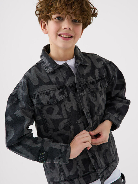 Джинсовая куртка оверсайз для мальчика подростка. Температурный режим до +15С. Изготовлена из плотного чёрного денима с графичным принтом в виде надписей. Спереди есть два нагрудных и два боковых кармана. Центральная застежка – на болты, также кнопки есть на манжетах и поясе. Украшением служит шеврон на рукаве с объёмным принтом.