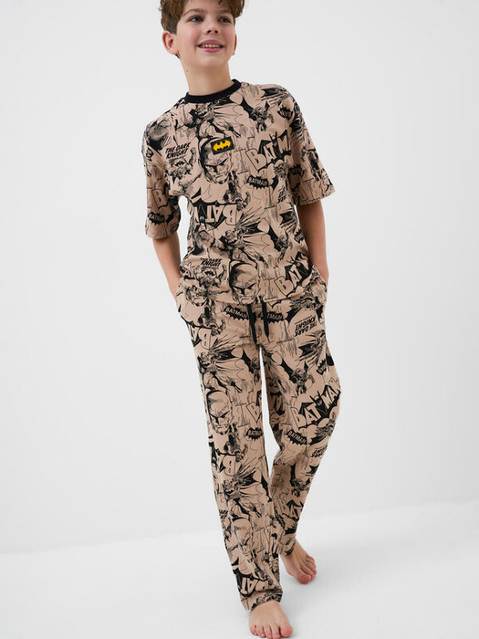 Пижама для мальчика подростка. Комплект состоит из оверсайз футболки с коротким рукавом и брюк. Изделие выполнено из мягкого, хлопкового трикотажа с ярким и насыщенным принтом в стиле комиксов про Бэтмена. На груди футболки размещён узнаваемый жёлтый логотип героя. Пояс брюк на резинке с дополнительным внутренним шнуром для регулировки. Боковые карманы.