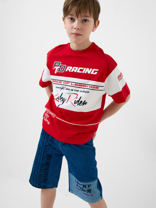 Стильные джинсовые шорты для мальчика подростка. Они выполнены в свободном, oversize крое чуть ниже колена. Основной материал — плотный деним тёмно-синего цвета, дополнен контрастными светлыми вставками. По всей длине шорт расположен эффектный принт в виде следов автомобильных шин, а спереди надпись Шорты имеют боковые и задние карманы, пояс со шлёвками и внутреннюю утяжку на резинке. Сзади — фирменная силиконовая нашивка с логотипом. Это модель с характером для активных и стильных подростков.