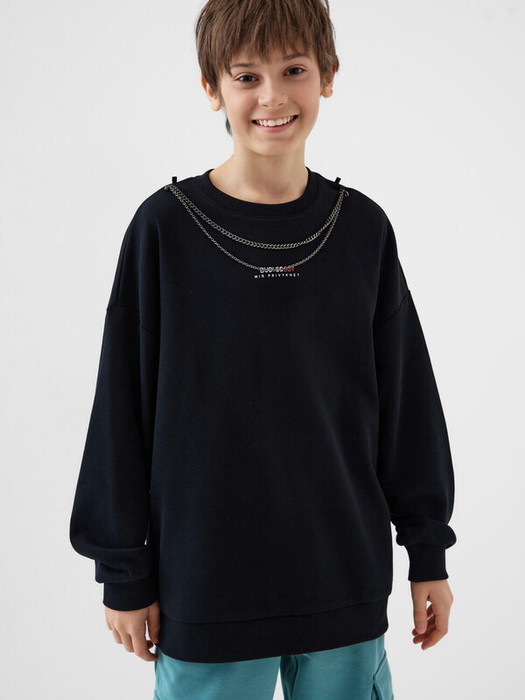 Толстовка трикотажная оверсайз для мальчика подростка. На груди расположен выразительный принт. Особенность дизайна — декоративная металлическая цепочка, которая крепится к горловине с помощью карабинов. Круглый вырез горловины, нижний край и манжеты выполнены из риба, что обеспечивает комфортную посадку. Свитшот хорошо подойдёт для весенне-летнего сезона.