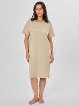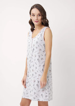 Халат женский из трикотажного полотна «кулирка» с набивным рисунком, прямого силуэта, с короткими втачными рукавами, горловиной V- образной формы, карманами в боковых швах и центральной бортовой застежкой на тесьму «молния». Полочка – с двумя небольшими двойными кокетками, выполненными по косой линии. Горловина переда, входы в карманы окантованы контрастным материалом.