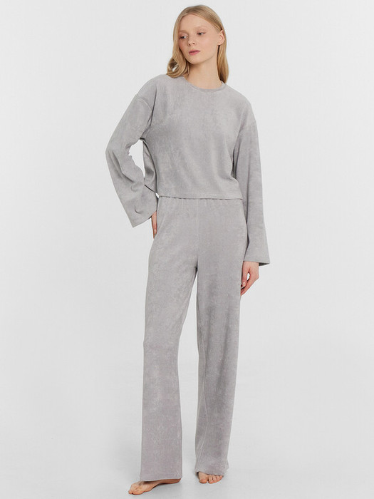 Комплект состоит из джемпера и брюк свободного силуэта. Длина джемпера ниже талии. Перед и спинка цельнокроеные. Рукава втачные, длинные, спущенная линия плеча. Горловина округлой формы, обтачка из основного полотна. Низ изделия и рукавов в подгибку.