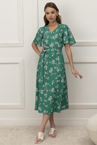 Женское летнее платье в длине миди. Модель имеет широкую резинку по талии. Верхняя часть дополнена подкладкой для комфорта. Хлопковая ткань с тонким фактурным рисунком и цветочными элементами придаёт изделию нежный и воздушный вид. V-образный вырез делает образ более выразительным.