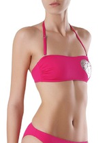 Раздельный купальник эффектного фиолетового цвета с золотой нитью, создающей мерцание, состоит из бюстгальтера и плавок. Бюстгальтер - бандо с мягкой чашкой без каркасов, с боковыми корсетными вставкми и съемным вкладышем. Бретель завязывается на шее и  отстегивается. На спинке пластиковая застежка. Плавки на подкладе, с завышенной линией талии и высоким вырезом ножек. На задней части плавок декоративное кольцо, создающее объем и обеспечивающее удобную посадку.