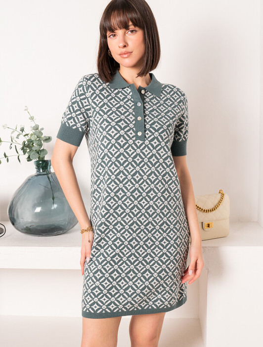 Платье длины мини с воротником поло выполнено из мягкого трикотажа на основе шелковистой эластичной вискозы. Жаккардовое переплетение образует геометрический узор. Застежка на перламутровые пуговицы подчеркивает гладкость пряжи. Контрастный воротник и манжеты делают узор еще более выразительным. Можно сочетать с жакетом D31.388 из жаккардовой коллекции.