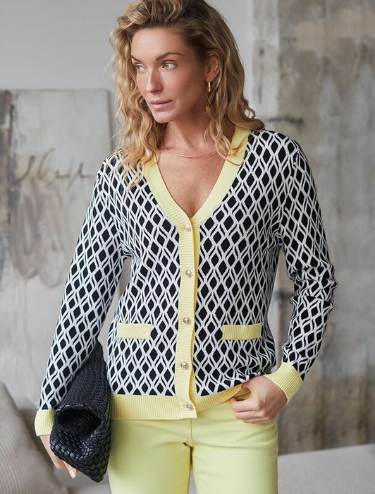 Кардиган с V-вырезом жаккардовой вязки  — универсальная и женственная вещь для весны и лета. Бело-черный жакет выполнен из приятной к телу вискозы, отличается в меру свободным кроем, который подчеркивает силуэт. V-вырез подчеркивает зону декольте и визуально вытягивает шею, делая фигуру более изящной. Спущенная линия плеча создает расслабленный силуэт, добавляя комфорта и свободы движений, что отлично подойдет для девушек и женщин плюс сайз размеров. Модель на пуговицах обеспечивает удобство в носке и добавляет классическую нотку образу. Контрастная отделка гармонично сочетается с выразительным геометрическим рисунком, который придает образу индивидуальность и современность. Принт немного напоминает благородный орнамент аргайл,  Карманы-обманки украшают, сохраняя лаконичность внешнего вида,  Кардиган средней длины оптимален для создания разных комбинаций на каждый день.  Такой жакет легко впишется в офисный или повседневный образ благодаря своей универсальности и современному стилю. Вискоза дарит ощущение ком