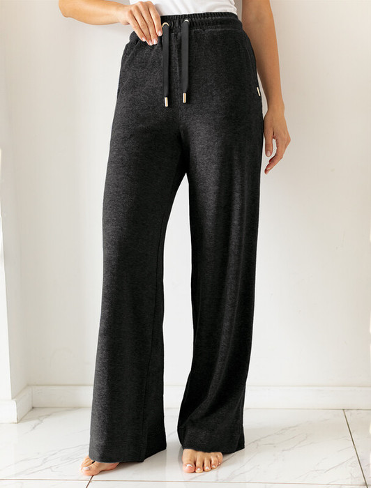 Прямые брюки выполнены из велюра. Модель с широким поясом дополнена шнурком из репсовой ленты и серебристой фурнитурой. Легкий и мягкий материал с матовой фактурой придает изделию нежность и комфорт. Хорошо держит тепло и форму – идеальное решение для домашнего отдыха. Сочетается в костюме с худи D49.053