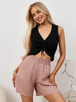 Шорты выполнены из футера двухнитки с эластаном. Модель прямого кроя дополнена боковыми карманами и одним задним карманом.  Пояс выполнен из эластичного трикотажа в рубчик. В пояс вставлен плоский хлопковый шнур в тон изделия с серебристыми наконечниками. Изделие дополнено металлическим логотипом бренда. Сочетается в костюме с жакетом D49.078, джемпером D49.079, D49.080 и футболкой D49.081