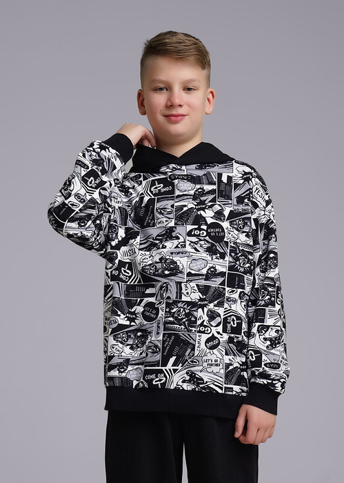 Принтованное худи из мягкого футера в комиксном стиле сделает любой look дерзким и модным! Его можно надеть с джинсами или спортивными джоггерами. Свободная посадка oversize, эластичные манжеты и пояс из кашкорсе.
