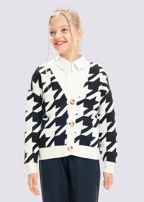Стильный кардиган из хлопка с добавлением акрила. Трендовая расцветка-крупная гусиная лапка.Свободный силуэт, спущенная линия плеча, застежка на пуговицы. По горловине, низу рукавов и изделия эластичная вязка.