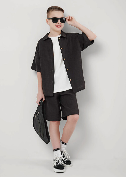 Муслиновые шорты для мальчика в цветах хаки и чёрный — лёгкие, дышащие, из натурального хлопка. Имеют регулировку по талии для комфортной посадки. Свободный крой не сковывает движения. Подходят для тёплой погоды и активных игр.