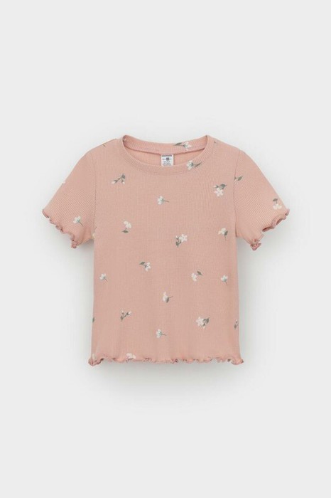 Футболка для девочки из эластичного трикотажа в рубчик. Оригинальная набивка выполнена из стойких текстильных красителей.