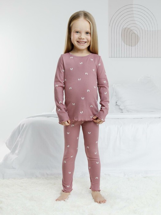 Трикотажная пижама в рубчик из натурального хлопка. Джемпер с длинными втачными рукавами и лосины с эластичной резинкой в поясе. Оригинальная набивка выполнена из стойких текстильных гипоаллергенных красителей. Изделие сохраняет цвет и форму после многократных стирок. Все трикотажные полотна производятся в соответствии с нормами швейцарского сертификата ЭкоТекс.