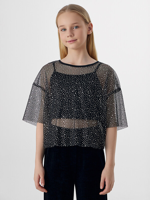 Верхняя блузка свободного силуэта. Перед и спинка цельнокроеные. Горловиа кругло формы, обработана бейкой из трикотажного кулирного полотна. Рукав втачной короткий, слека спущен. Нижняя блузка из трикотажного кулирного полотна на брителях. Верхняя и нижняя часть изделия соединины лентой атласной SFLA-1