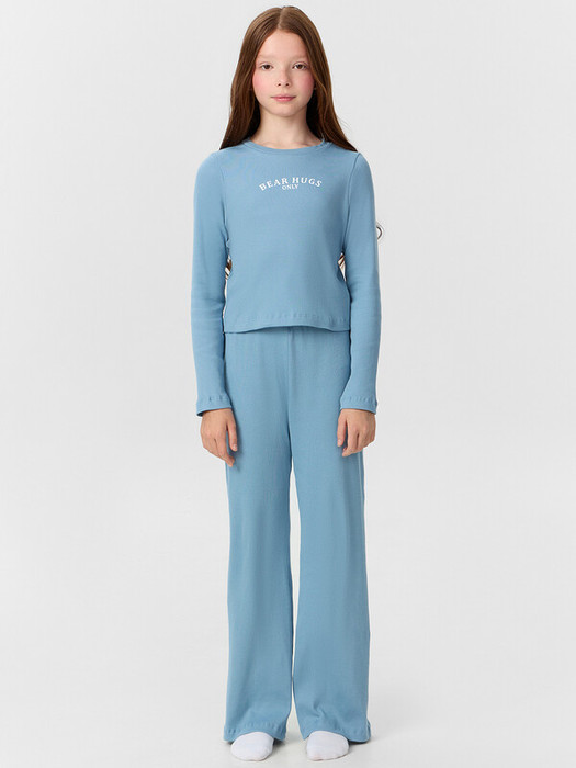 Лонгслив укороченный. Горловина круглой формы с притачной обтачкой из основного полотна. Рукава длинные втачные. Перед и спинка цельнокроеные. Низ лонгслива, рукавов и брюк обработан на 2-х игольной плоскошовной машине швом в подгибку.                                                                   Брюки длинные, прямые, свободные. Пояс цельнокроенный с эластичной тесьмой внутри (внутренняя резина 35RV) ширина 35мм.