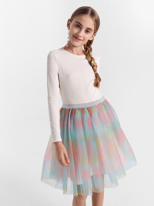 Платье полуприлегающего силуэта с отрезной юбкой. Длина выше колена. Горловина круглая, окантована бейкой из основного полотна. Рукав втачной длинный. Низ рукава обработан на 2-х игольной плоскошовной машине. Юбка трехслойная на сборке. Верхние два слоя из трикотажного полотна сетки, подкладка из трикотажного кулирного полотна. Пояс из жаккардовой тесьмы