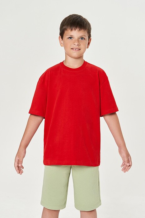 Футболка унисекс детская. Спущенное плечо, втачной рукав. Укрепление горловины спинки контрастной бейкой.