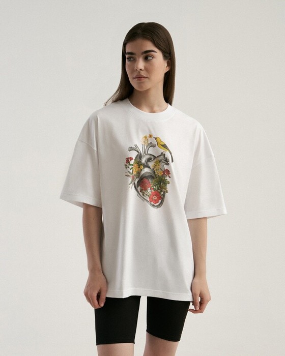 Футболка свободного силуэта. Спущенное плечо. Горловина из двух деталей, из рибаны.