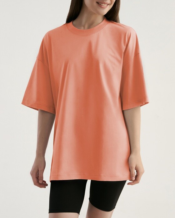 Футболка свободного силуэта. Спущенное плечо. Горловина из двух деталей, из рибаны.