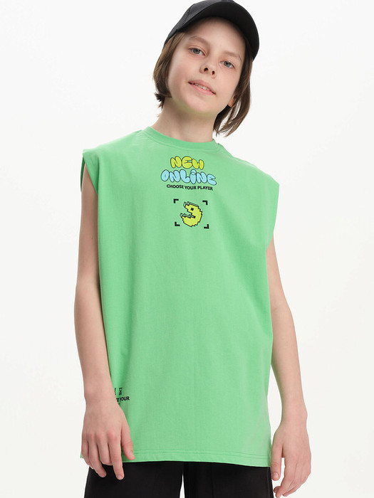 Летняя майка для мальчика свободного силуэта. Выполнена из 100% хлопка. Горловина из рибаны - голова не застрянет. По переду украшена ярким принтом с персонажем из игры Pac-man (пакмен) с надписями. Перевод надписей: "new online" - новый онлайн, "choose your player" - выбери своего игрока, "create your reality" - создавай свою реальность. Футболка без рукавов отлично подойдет для занятий спортом, походов на пляж и прогулок.