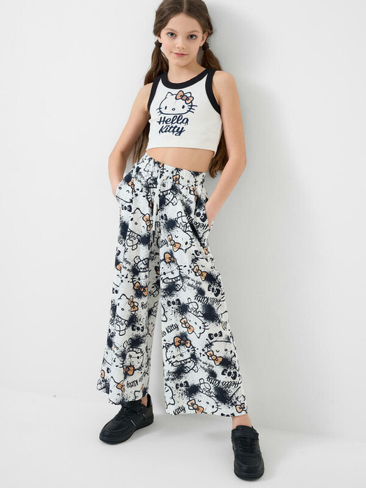 Комплект для девочки подростка. Базовый топ из хлопкового трикотажа в рубчик. Широкие брюки палаццо выполнены из хлопкового трикотажа джерси. Пояс на резинке со шнурком для регулировки посадки. Удобные боковые карманы. Принты с любимым мультяшным персонажем Хеллоу Китти.