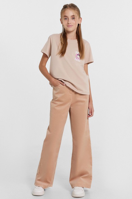 Брюки прямого силуэта. Посадка на талии. Пояс отрезной по переду гладкий, задняя деталь пояса с резиной внутри 40RV. По переду изделия карманы с отрезным бочком. Низ изделия обработан швом в подгибку.