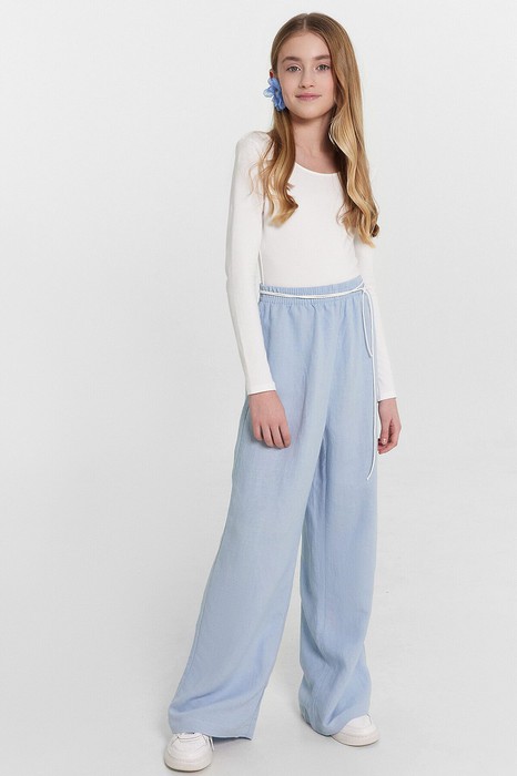 Брюки для девочек широкие. Посадка высокая. Пояс цельнокроеный из основного полотна, застрочен с эластичной тесьмой RV40 внутри, по поясу проложены отделочные строчки. В боковых швах обработаны карманы. Низ брюк обработан швом в подгибку.